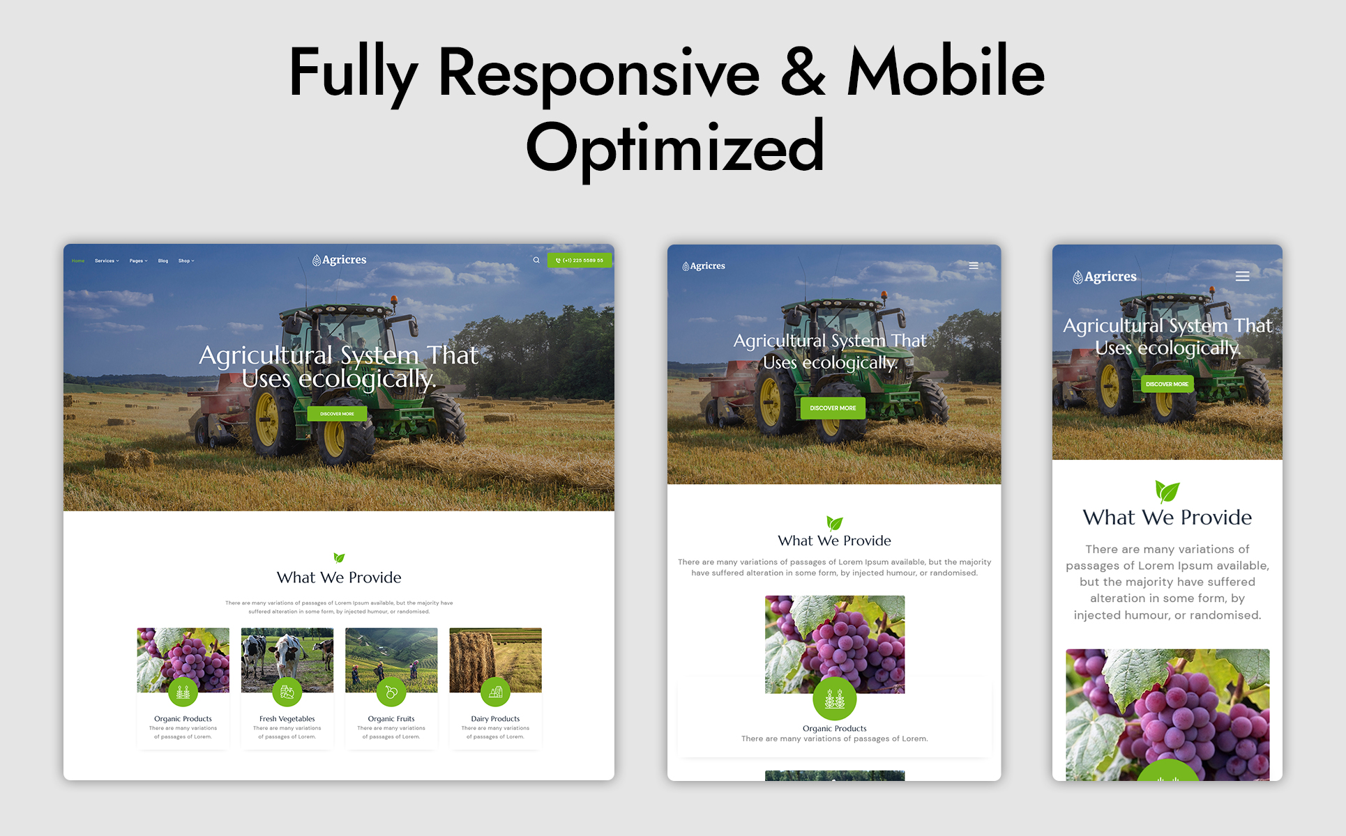 Agricres comes with a wide range of features that are specifically tailored to meet the needs of agriculture and organic farming businesses. The theme includes multiple homepage layouts, customizable sliders, and a variety of pre-designed templates for showcasing your products, services, and team members.