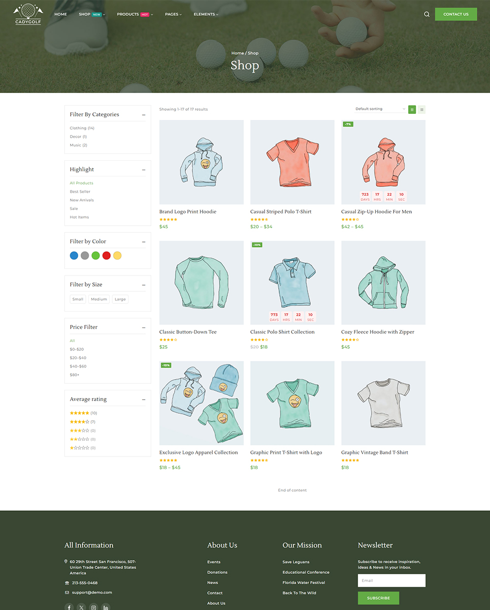 Cadygolf comes packed with advanced features to help you create a unique and engaging website. With the Elementor page builder plugin, you can easily customize every aspect of your site with drag-and-drop functionality. The theme is fully responsive, ensuring your website looks great on all devices. Additionally, Cadygolf is WooCommerce compatible, allowing you to sell merchandise, memberships, and event tickets directly from your site.