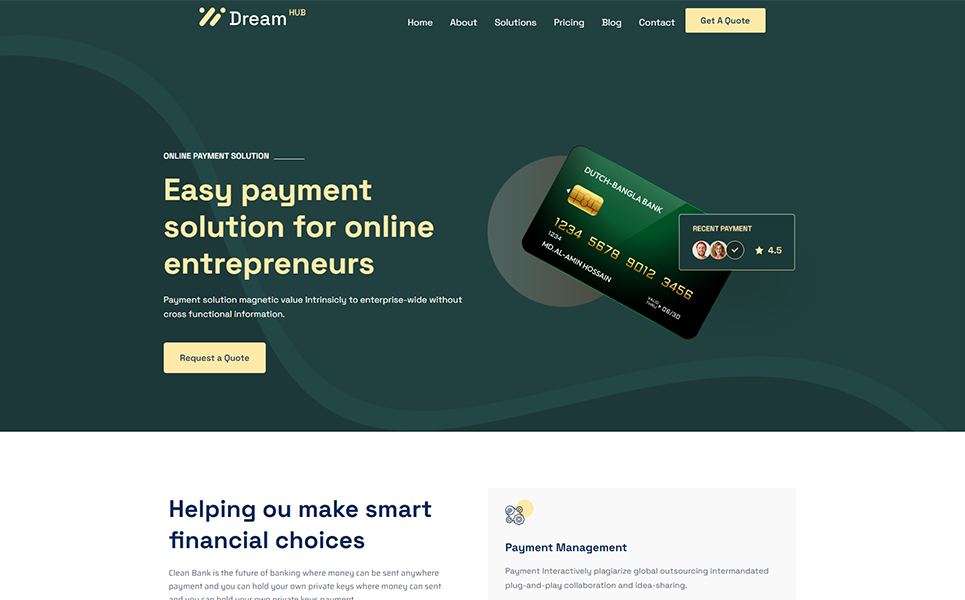 With a sleek and modern design, DreamHub is fully responsive and mobile-friendly, ensuring that your website looks great on any device. Whether your customers are browsing on a desktop computer, tablet, or smartphone, they will have a seamless experience that showcases your payment solutions and financial services in the best possible light.