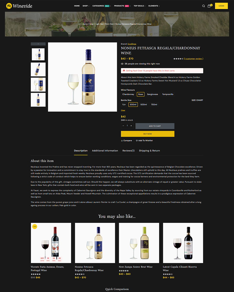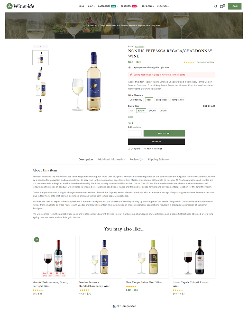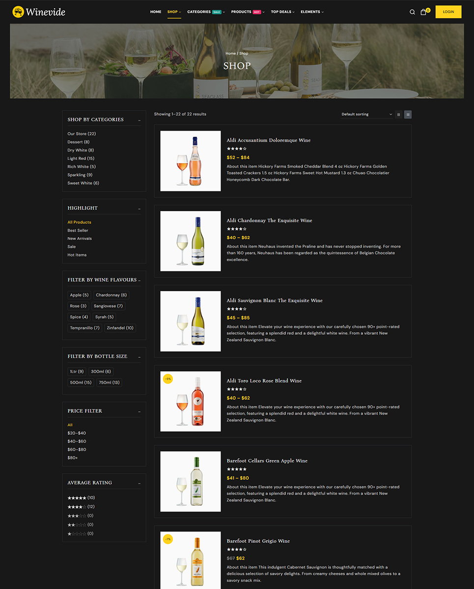 Winevide is fully integrated with WooCommerce, the most popular eCommerce platform for WordPress. This means you can easily set up your online shop, manage your inventory, and process payments with ease. The theme also includes a variety of shop layouts and product display options to help you showcase your wines in the best possible way.